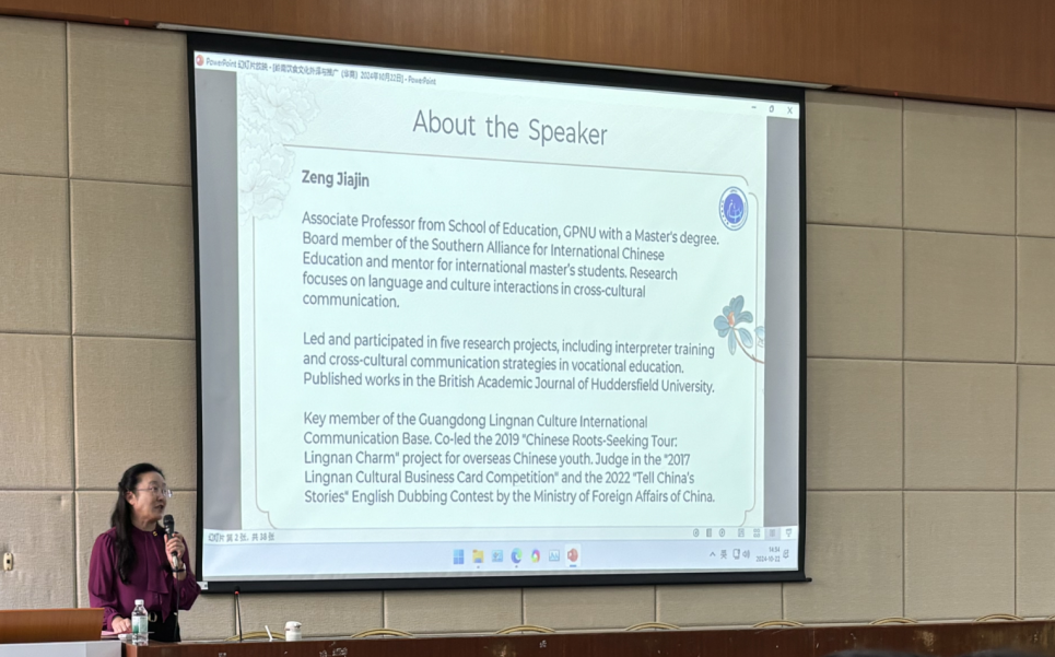 To strengthen university students' cultural confidence and deepen their understanding of the cultural phenomena around them, especially the international influence of Lingnan culture, the International School of Guangzhou Huashang College hosted the 31st Cultural Quality Lecture on October 22, 2024. The lecture focused on the translation and dissemination of Lingnan cuisine culture, featuring Associate Professor Zeng Jiajin, a council member of the Southern Alliance for International Chinese Education and a member of the Guangdong Technical Normal University Alumni Association, as the keynote speaker. Over 100 students from the Teacher Education College, School of Health and Medicine, School of Communication and Media, and School of Foreign Languages attended the lecture, along with faculty members from the International School.