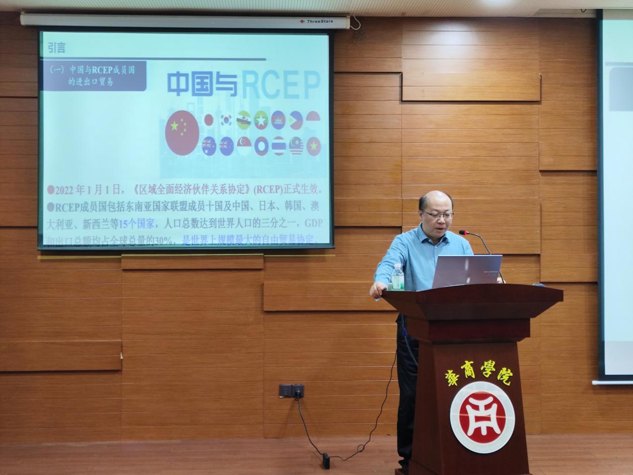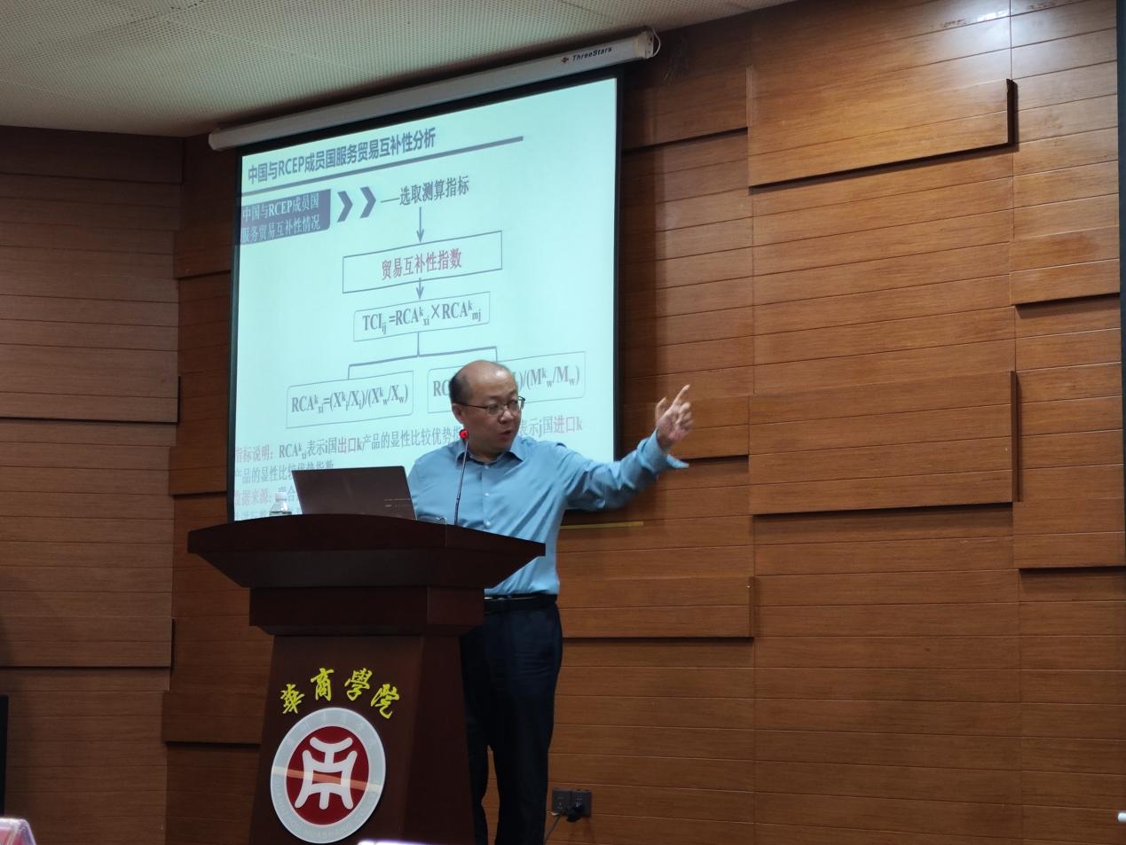 First, Associate Professor Wang Tieshan started from the perspective of the competitiveness of service trade between China and RCEP member countries, explaining the background and significance of RCEP, emphasizing the important role of service trade in constructing a new development pattern. Using multiple indicators such as international market share and trade competitiveness index, he thoroughly analyzed the competitive situation and complementary advantages of service trade between China and RCEP member countries, which sparked discussion and reflection among the teachers and students present.