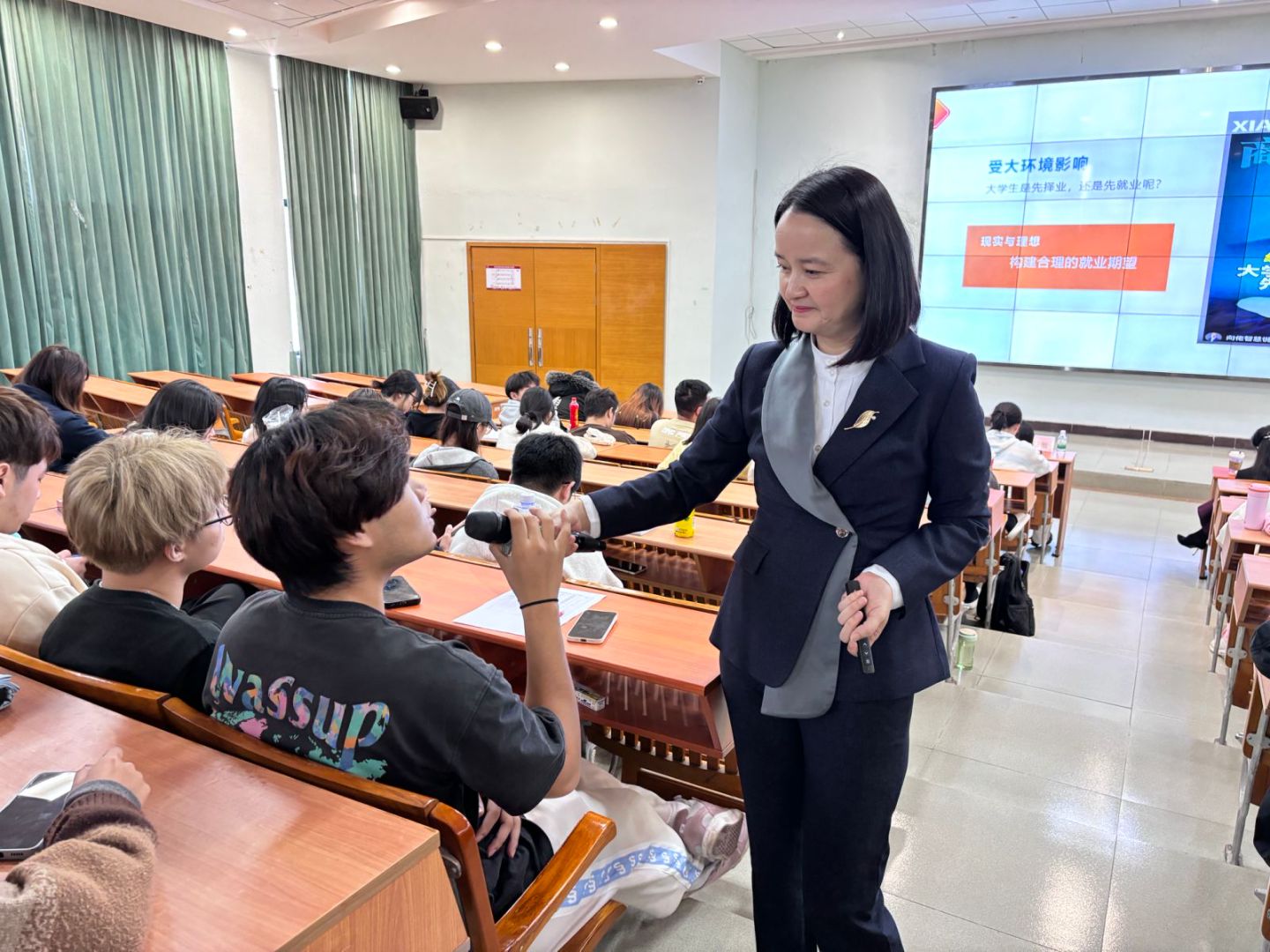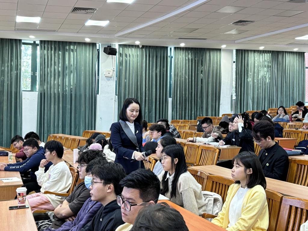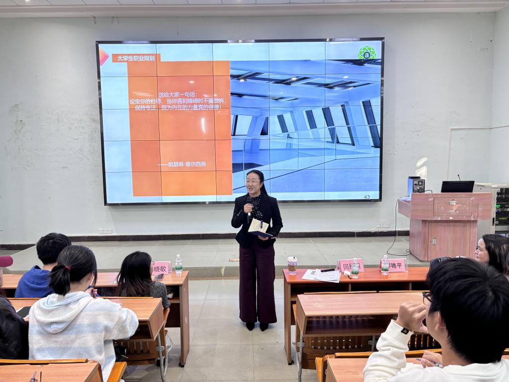 Ms. Zou Yanping began the lecture by interacting and engaging with the students. She then analyzed the employment market trends of the past five years, emphasizing the importance of workplace competitiveness and early career planning. Regarding career planning, she guided students in self-assessment, helping them recognize their strengths and weaknesses while clarifying the role of interests, abilities, and aspirations in career choices. She encouraged students to strive for higher GPAs, obtain professional certifications, and actively participate in social practice and internships to enrich their experience and resumes.