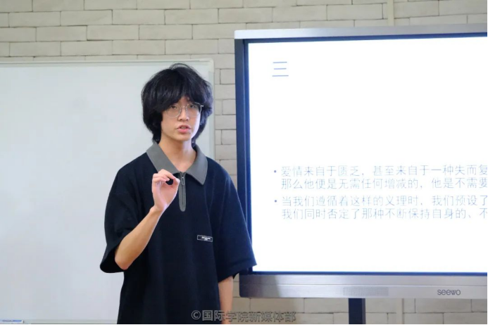 The second candidate Lu Yunzhi, majoring in English of the International Class of Grade 2022, shared the book The Art of Loving. The book contains a philosophical thought: each person is an individual, and self-value doesn’t depend on anyone’s evaluation. In addition, he pointed out that the book contrasts love with physical passion, but ignores ethics as a higher dimension. Finally, he told that each person could get love experience through himself.