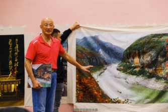 Mr. Yang Yixin Displaying the Silk Painting Scrolls