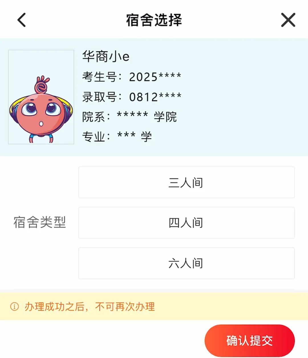 如果我选了宿舍后面又反悔了,可以更改吗?如果已经选了房型还未付款,可以等到支付有效时间过了之后重新选择房型;若已支付成功的则无法更换房型。