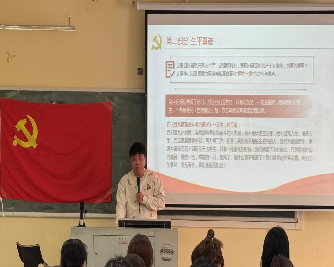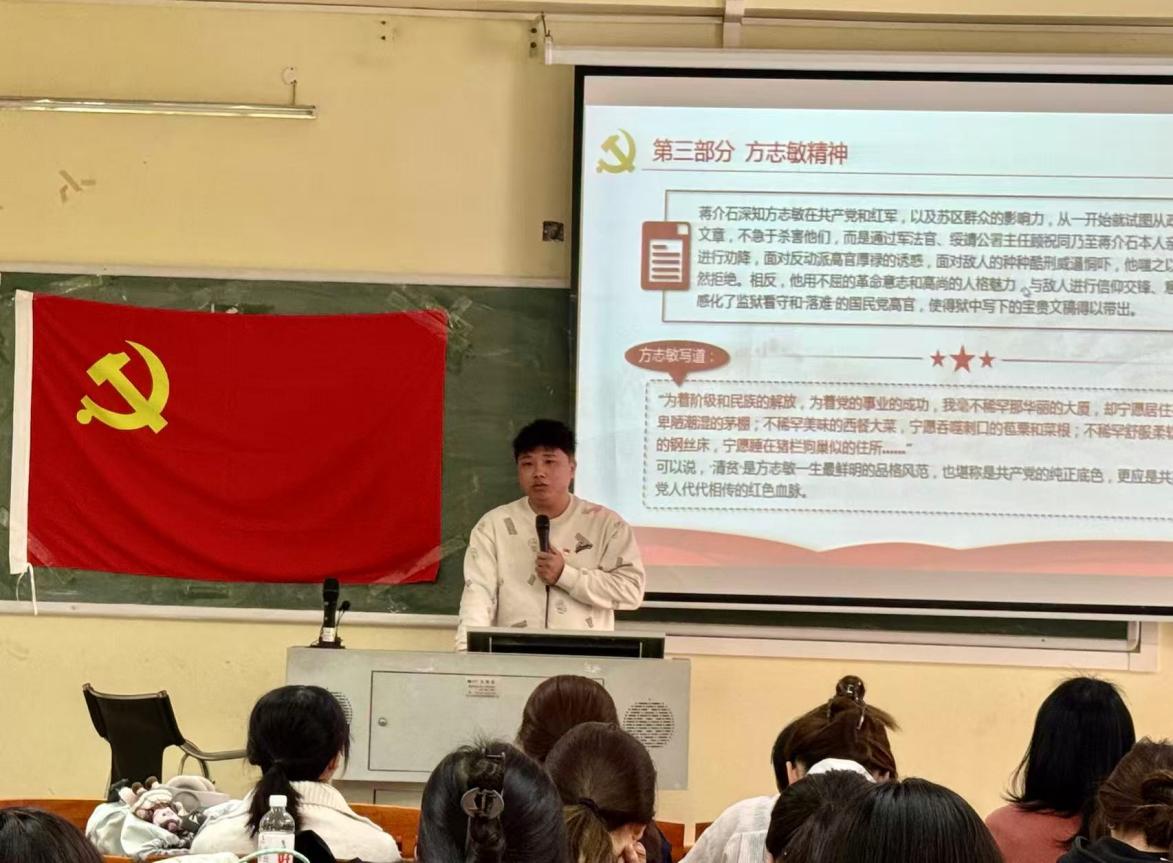 本次主题党课的核心内容是讲述方志敏烈士的光辉事迹与不朽精神。吴老师以翔实的史料,生动再现了方志敏同志的革命人生:他生于1899年,1924年加入中国共产党,是赣东北革命根据地和红十军团的主要创建者。在土地革命战争时期,他领导军民多次粉碎国民党反动派的“围剿”,展现了卓越的军事指挥才能和坚定的革命意志。1935年不幸被捕后,他在狱中极端艰苦的条件下,写下了《可爱的中国》《清贫》等震撼人心的不朽著作,抒发了对祖国深沉的热爱和对共产主义事业的无限忠诚,直至英勇就义。2009年,方志敏被评为“100位为新中国成立作出突出贡献的英雄模范人物”。