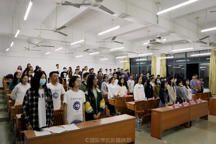大会伊始,同学们起立奏唱团歌。雄壮激昂的歌声在课室回荡,我们始终铭记自己的团员身份,如五月的花海,用青春拥抱时代。