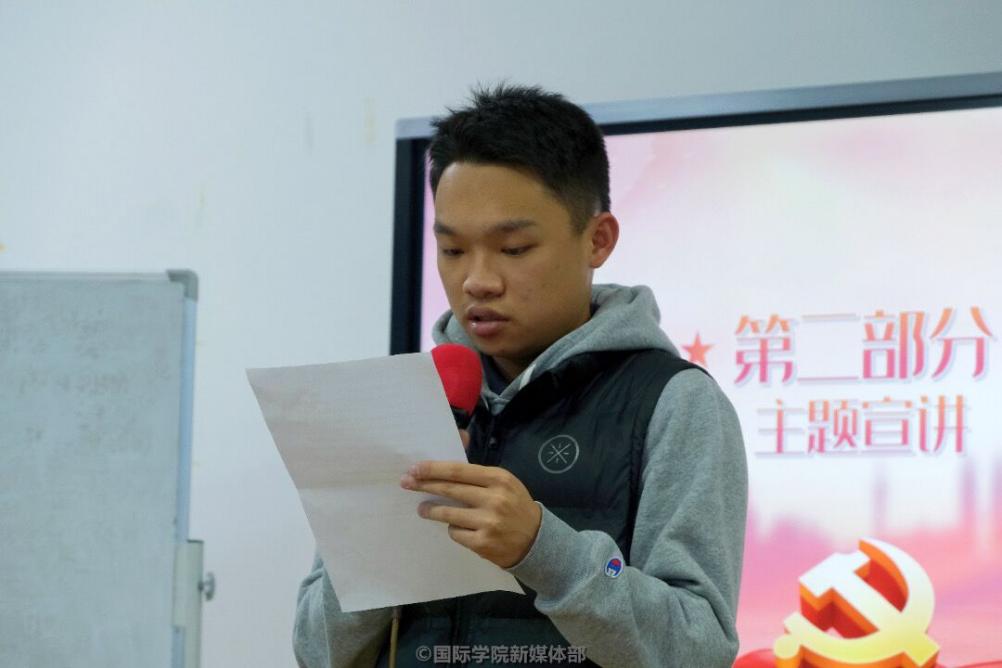 首先,由19级英语海外创新班的张子扬作为学生代表进行发言。他说道,从建党的开天辟地,到新中国成立的改天换地,到改革开放的翻天覆地,再到党的十八大以来党和国家事业取得历史性成就、发生历史性变革,根本原因就在于我们党始终坚守了为中国人民谋幸福、为中华民族谋复兴的初心和使命。在全面建设社会主义现代化国家新征程上,始终做到初心如磐、使命在肩,党的光荣而伟大的事业必将无往而不胜。