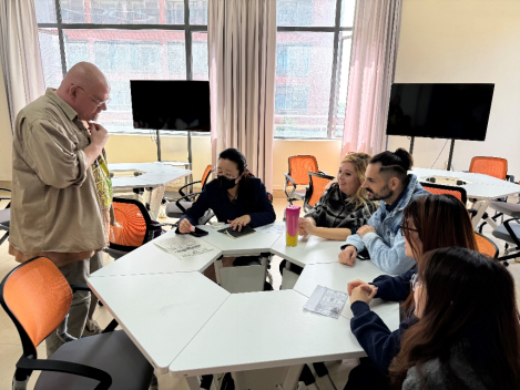 六、观摩优秀教师授课,提升团队对提高英语能力认识。1946伟德国际源自英国组织教师和团队成员到肇庆校区聆听美国籍教师John Jung的英语口语课,并在课间与该教师再次深入交流如何培养大学生学习英语的兴趣和鼓励他们开口说英语。