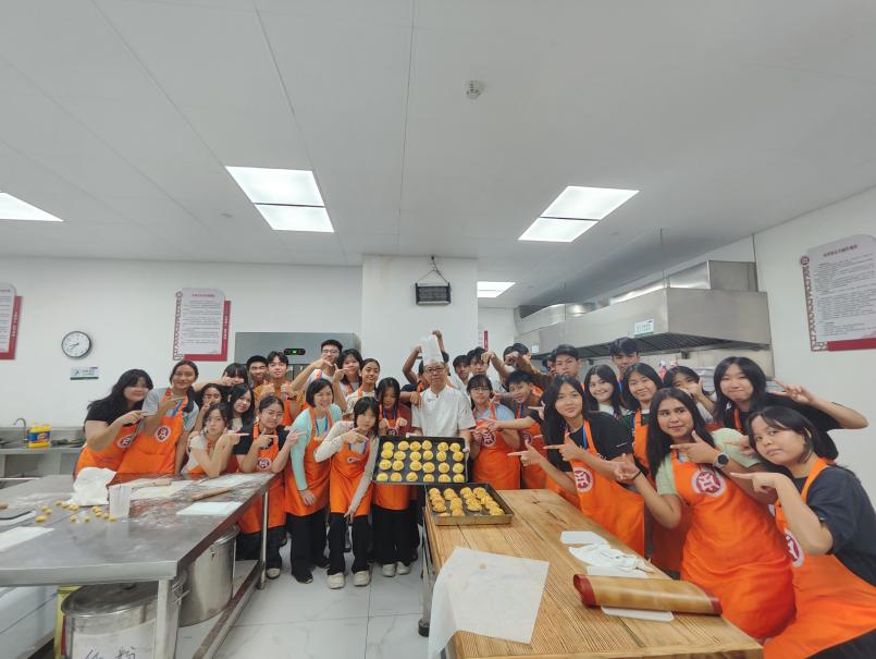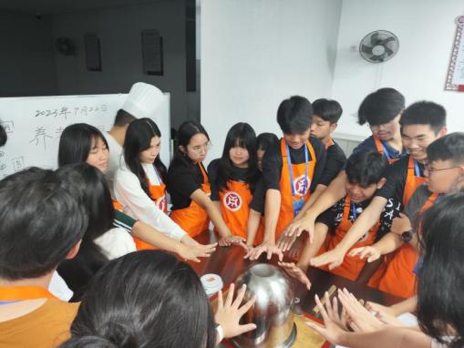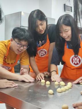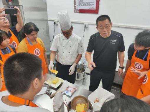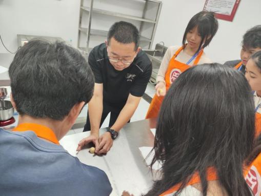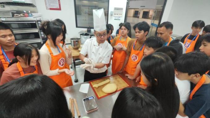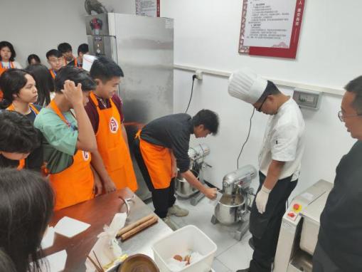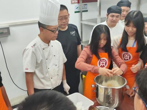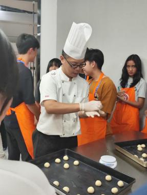 晚饭后,华商和印尼学生跟随广州华商职业学院酒店管理学院崔毅峰老师,进入太阳城大酒店的西餐厨房,学习制作粤式餐点——菠萝包。通过崔老师耐心细致的讲解和现场示范,华商和印尼学生亲手体验了打蛋、称量材料、调配面粉与水比例等关键步骤,并揉面制作和烘焙。令学生们兴奋的是,他们还亲自品尝了自己制作的餐点,进而体会到做好任何一项工作的不易。