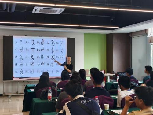 在魅力汉字课上,回雁雁院长从仓颉造字讲起,与学生分享了象形文字的起源、发展,以及汉字在记录中国历朝历代波澜壮阔历史的重要作用,并一笔一划地教印尼学生书写汉字,还强调了汉字笔画在中国选举姓名排序的作用。