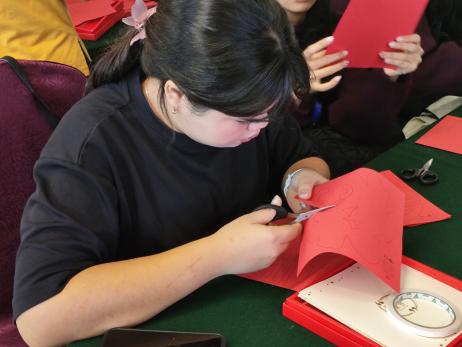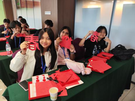 王咏悦老师通过教学生亲手剪代表欣欣向荣的“春”字、代表和和美美的“喜”字、代表好运连连的红灯笼,让印尼学生们在发挥各自想象力的同时体会中国民间工艺美术家追求精益求精和用艺术装点美好生活的愿望。