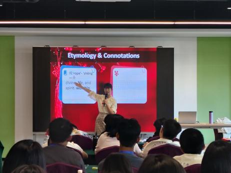 在《中国结:编织中的中华文化》课堂上,熊卫老师向学生们介绍了中国结的历史背景、象征意义以及丰富多样的款式,中国结是一种手工编织工艺品,它身上所显示的情致与智慧是汉族古老文明的一个侧面。在战国时代的青铜器上经常有中国结图案出现,可以代表汉族悠久的历史,符合中国传统装饰的习俗和审美,故命名中国结。中国结代表着团结幸福平安。通过讲授,学生们对中国结这一中华文化符号有了更深入的了解。在熊卫老师的耐心指导下,学生们在实践中感受到了编织中国结的乐趣,也更加贴近这一传统手工艺的文化内涵。