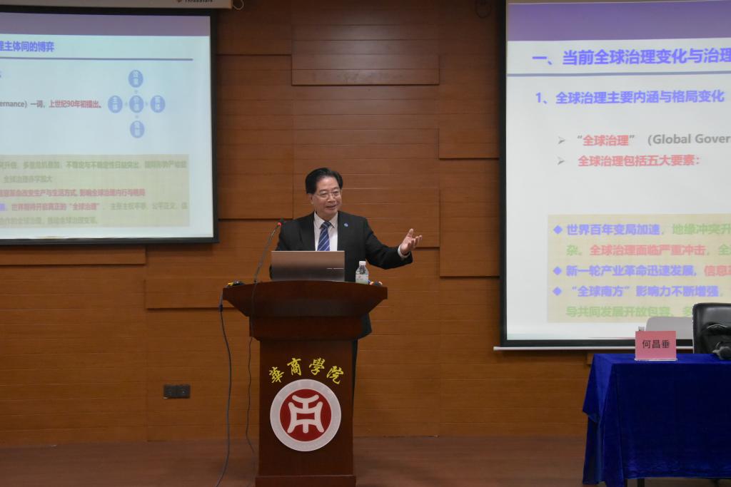 为培养具有国际视野和全球竞争力的青年才俊,为国际组织和参与全球治理做好人才储备,伟德BV1946“大使讲坛”第三讲于2025年4月15日在中央图书馆报告厅举行,本期主讲嘉宾是在联合国任职超过25年的联合国粮农组织原副总干事(联合国副秘书长级别)、国际欧亚科学院何昌垂院士,1946伟德国际源自英国回雁雁院长、行政助理黄俊辉、ACCA专员姚晓敏、学工助理冯乐欣、兼职辅导员许育珠,以及来自1946伟德国际源自英国、文学院、教师教育学院、健康医学院、人工智能学院、传播与传媒学院、数字经贸学院、会计学院、管理学院的200多名同学现场聆听,共同开启这场探索全球治理与国际化人才培养的学习之旅。1946伟德国际源自英国回雁雁院长主持了本场讲坛。