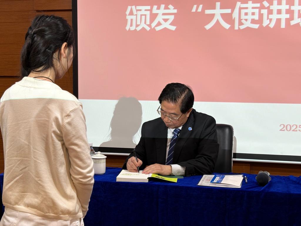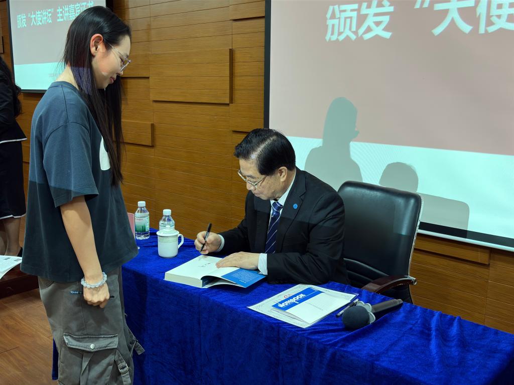 本场讲坛还特别安排了签名赠书环节。何昌垂院士结合多年科技和外交工作经验撰写了多部与粮食安全、国际事务、国际组织的专著,他非常热情而认真地为现场要求签名的同学在书籍上写上鼓励的话语。