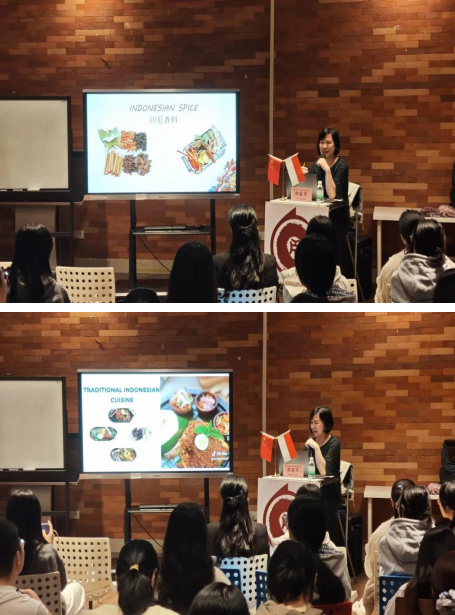 为从语言与饮食双重视角深化对印尼的认知,Jocelyn老师首先普及了印尼语的基础发音与“Selamatpagi(早上好) ”等常用问候语,并组织学生进行了简单的互动练习。随后进入饮食文化环节,她借助美食图片与习俗讲解,带领大家展开一场从苏门答腊的沙爹烤肉、到爪哇的印尼炒饭、再到巴厘岛脏鸭餐的风味巡礼,生动诠释了不同地域的食材搭配与烹饪技法,揭示了其背后独特的生活方式与文化交融印记。