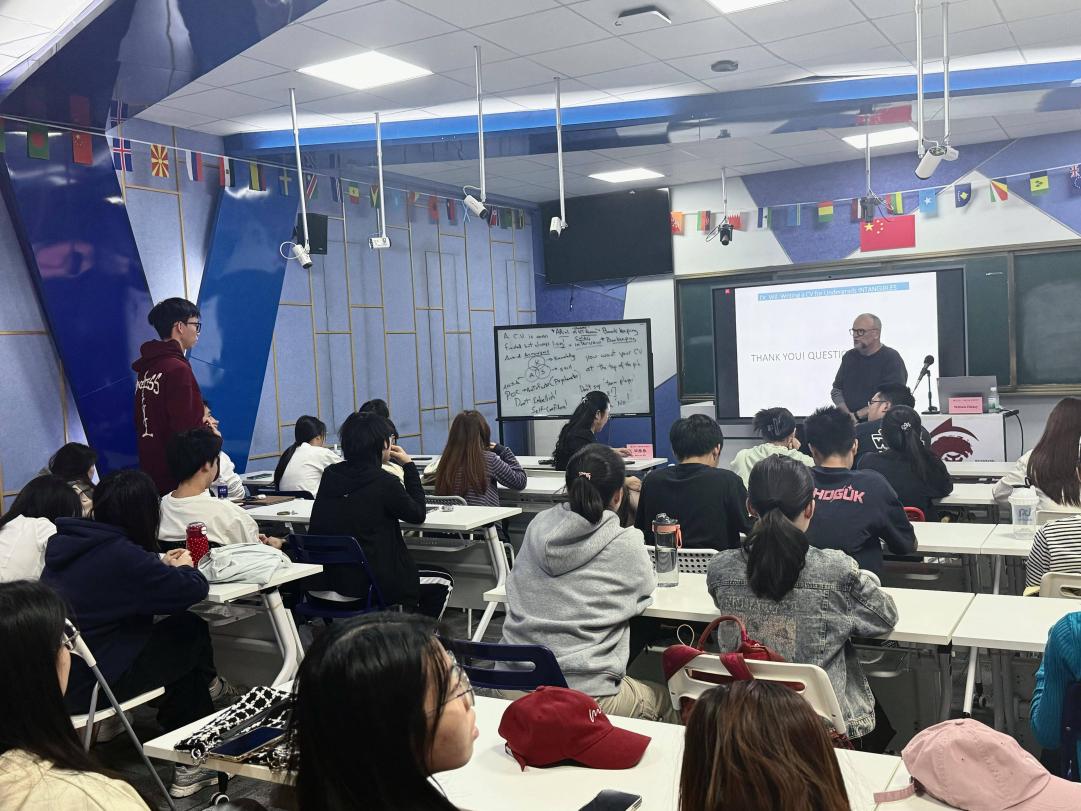 在讲座最后,Hickey博士就岗位需求、求职注意事项及英语面试等话题,与现场同学进行了互动答疑。本次分享兼具理论高度与实操价值,不仅系统剖析了数字时代简历的撰写逻辑,也为学子们在求职竞争中赢得优势提供了清晰指引。正如Hickey博士所说:“简历是职业发展的起点,精准的表达能让潜力被看见。”本次讲座不仅拓宽了同学们的职业视野,也让大家对简历撰写有了更清晰的认识,进一步增强了未来投身国际化企业求职的信心。