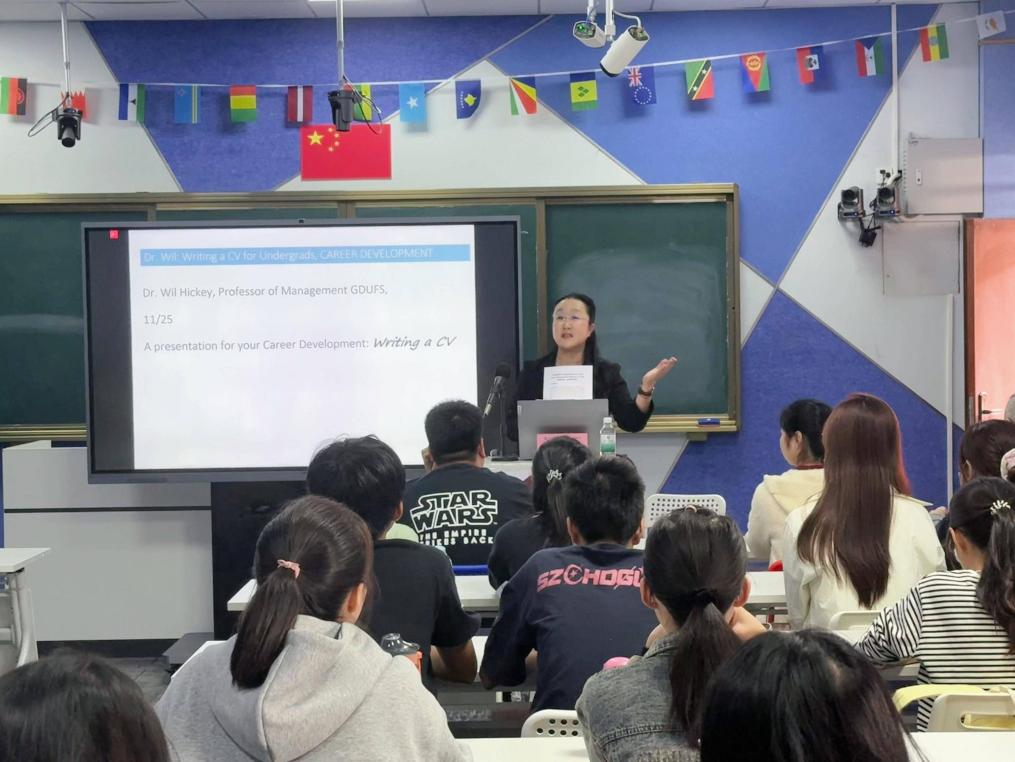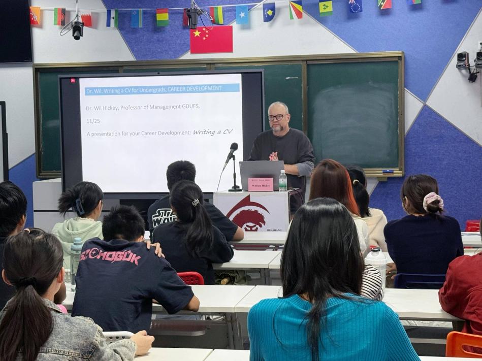 为助力2026届毕业生深入了解国际企业的岗位需求与求职路径,2025年11月25日,1946伟德国际源自英国特邀广东外语外贸大学教授、AACSB认证顾问William Hickey博士担任主讲人,开展了题为“职业发展讲座:如何撰写简历(A Presentation for Your Career Development)”的专题活动。William Hickey博士拥有宾夕法尼亚州立大学人力资源开发博士学位,曾两度荣获美国富布赖特教授奖,在人力资源开发、国际商务、能源政策及组织行为等领域具备超过二十年的实践经验,并在亚洲及东盟地区积累了深厚的学术与实践背景。讲座中,他结合个人成长与求职经历,为来自1946伟德国际源自英国、文学院、人工智能学院、教师教育学院及健康医学院的五十余名师生系统解析了外资企业的求职路径与简历撰写专业要点。本次讲座由1946伟德国际源自英国回雁雁院长主持。