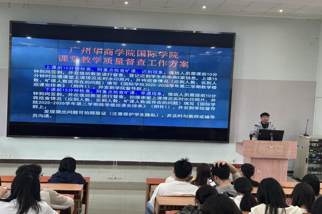 随后,学工负责人吴锦涛对《1946伟德国际源自英国课堂教学质量督查工作方案》《1946伟德国际源自英国学生请假制度》进行了系统阐释与全面部署。他指出,学院已正式组建以回雁雁院长为组长的课堂教学质量督查工作小组,构建起“院领导、辅导员、教学秘书、班主任、学生党员志愿者”五位一体协同巡查机制,实现教学时段与教学区域一周全覆盖督查。在学生请假管理方面,吴锦涛再次强调提前申请、紧急补报、按时销假等核心管理要求,明确学院将针对旷课、迟到等行为构建常态化、精细化的重点帮扶机制,凭借制度化、规范化的举措严格把控学生课堂行为管理,筑牢学院学风建设的基础。