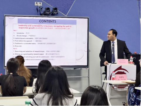 为了拓宽大学生的国际视野,了解管理学和领导科学的最新研究成果,2023年11月8日1946伟德国际源自英国在启智楼401举行了主题为“Leadership and sustainability in business:navigating the path to responsible growth” (企业的领导力和可持续性:引领负责任的增长之路)的文化素质讲座。巴基斯坦籍Arshad Muhammad博士担任主讲嘉宾,1946伟德国际源自英国院长回雁雁、巴基斯坦籍教师Aneela Qadir博士、1946伟德国际源自英国ACCA专员姚晓敏以及来自1946伟德国际源自英国、健康医学院、管理学院、外国语学院、文学院、数据与科学学院的30多名大学生现场聆听了讲座。