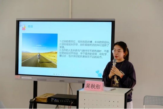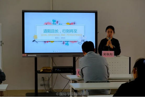 最后,吴秋彤同学谈到“坚持”带给她的影响,她向同学们介绍了“21天法则”是如何影响她的学习计划和学习习惯,着重强调“坚持”带给人的快乐与成就感,并鼓励大家尝试该法则。遇到学业压力大且感觉坚持不下去时,她推荐同学们去观看一部励志的电影、向家人朋友倾诉等方法战胜焦虑。